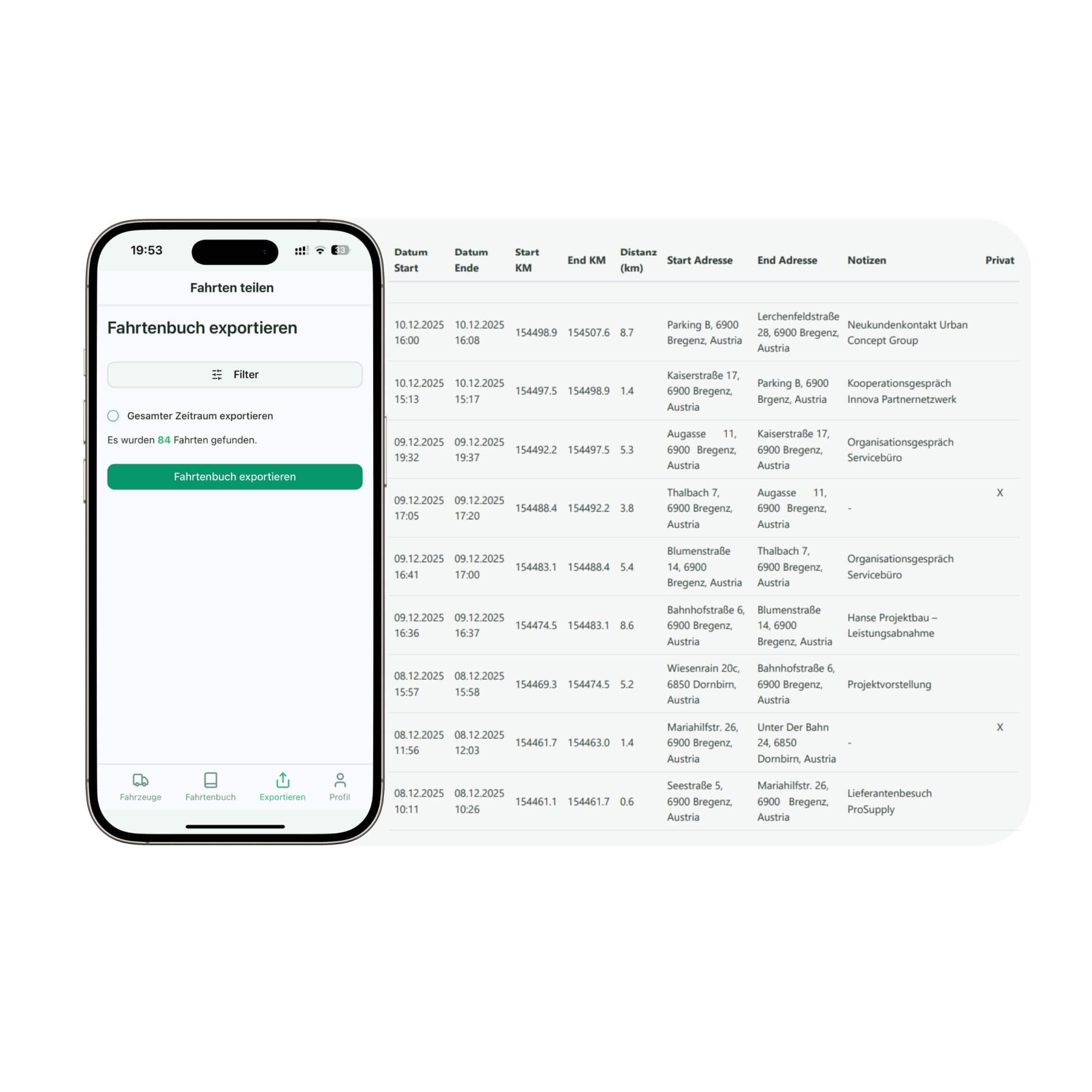 Exportiere Fahrdaten bequem als PDF – perfekt für den Steuerberater oder interne Berichte.